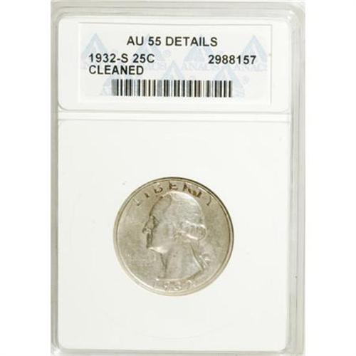 <B>1932-S 25C --Cleaned--ANACS. AU55 Details.</B></I> NGC Census: (170/1749). PCGS Population (222/2569). Mintage: 408,000. Numismedia Wsl. Price for NGC/PCGS coin in AU55: $275. (#5792)<BR><BR><B>Coin Engraver:</B> John Flanagan<BR><BR><b>Shipping:</b> Coins & Currency (<a target="_blank" href="http://www.heritageauctions.com/common/shipping.php">view shipping information</a>)