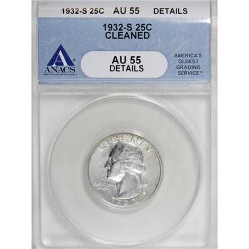 <B>1932-S 25C --Cleaned--ANACS. AU55 Details.</B></I> NGC Census: (178/1848). PCGS Population (240/2759). Mintage: 408,000. Numismedia Wsl. Price for NGC/PCGS coin in AU55: $280. (#5792)<BR><BR><B>Coin Engraver:</B> John Flanagan<BR><BR><b>Shipping:</b> Coins & Currency (<a target="_blank" href="http://www.heritageauctions.com/common/shipping.php">view shipping information</a>)