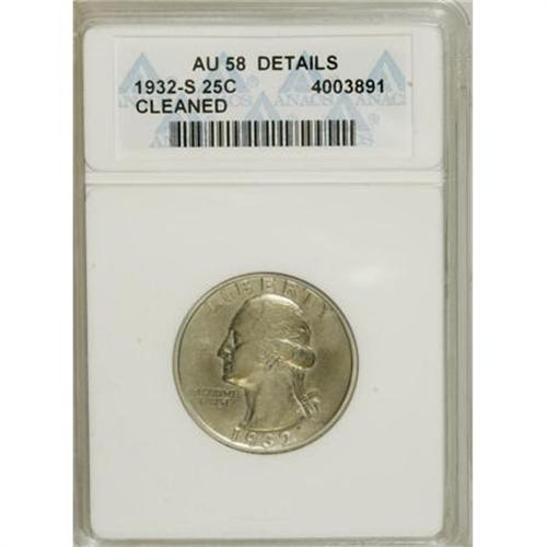 <B>1932-S 25C --Cleaned--ANACS. AU58 Details.</B></I> NGC Census: (327/1474). PCGS Population (463/2178). Mintage: 408,000. Numismedia Wsl. Price for NGC/PCGS coin in AU58: $321. (#5792)<BR><BR><B>Coin Engraver:</B> John Flanagan<BR><BR><b>Shipping:</b> Coins & Currency (<a target="_blank" href="http://www.heritageauctions.com/common/shipping.php">view shipping information</a>)