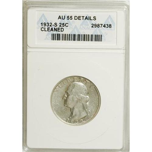 <B>1932-S 25C --Cleaned--ANACS. AU55 Details.</B></I> NGC Census: (170/1749). PCGS Population (222/2569). Mintage: 408,000. Numismedia Wsl. Price for NGC/PCGS coin in AU55: $275. (#5792)<BR><BR><b>Shipping:</b> Coins & Currency (<a target="_blank" href="http://www.heritageauctions.com/common/shipping.php">view shipping information</a>)