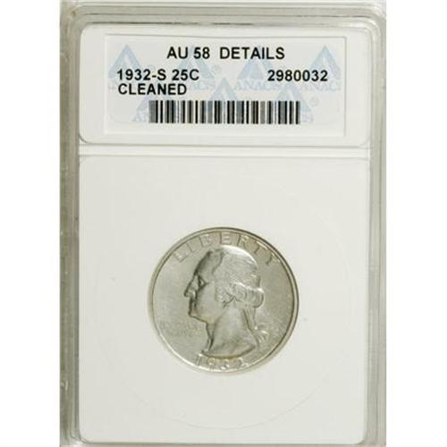 <B>1932-S 25C --Cleaned--ANACS. AU58 Details.</B></I> NGC Census: (313/1360). PCGS Population (455/2114). Mintage: 408,000. Numismedia Wsl. Price for NGC/PCGS coin in AU58: $321. (#5792)<BR><BR><b>Shipping:</b> Coins & Currency (<a target="_blank" href="http://www.heritageauctions.com/common/shipping.php">view shipping information</a>)
