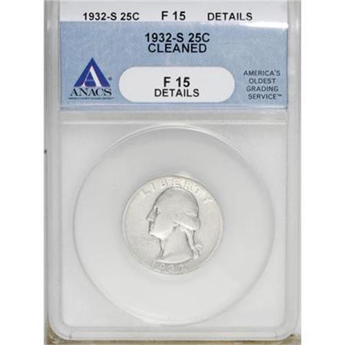 <B>1932-S 25C --Cleaned--ANACS. F15 Details.</B></I> NGC Census: (15/2328). PCGS Population (35/3471). Mintage: 408,000. Numismedia Wsl. Price for NGC/PCGS coin in F15: $167. (#5792)<BR><BR><B>Coin Engraver:</B> John Flanagan<BR><BR><b>Shipping:</b> Coins & Currency (<a target="_blank" href="http://www.heritageauctions.com/common/shipping.php">view shipping information</a>)