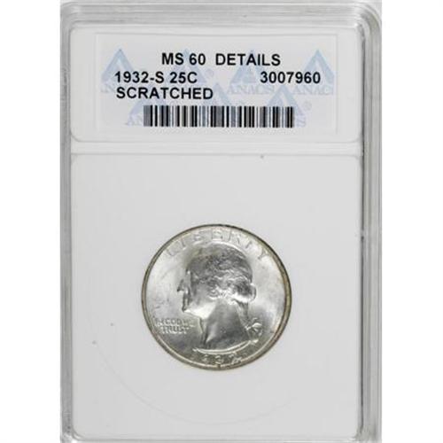 <B>1932-S 25C --Scratched--ANACS. MS60 Details.</B></I> NGC Census: (9/1465). PCGS Population (27/2123). Mintage: 408,000. Numismedia Wsl. Price for NGC/PCGS coin in MS60: $420. (#5792)<BR><BR><B>Coin Engraver:</B> John Flanagan<BR><BR><b>Shipping:</b> Coins & Currency (<a target="_blank" href="http://www.heritageauctions.com/common/shipping.php">view shipping information</a>)
