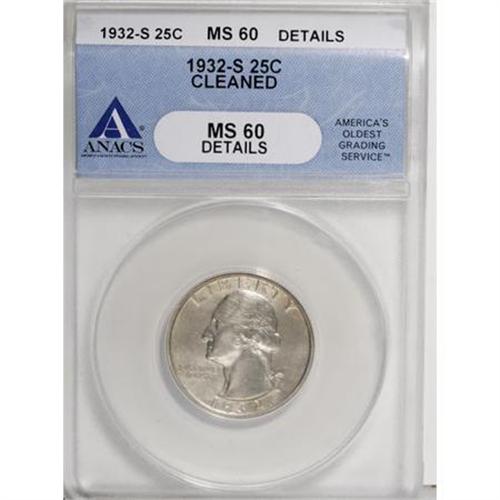 <B>1932-S 25C --Cleaned--ANACS. MS60 Details.</B></I> NGC Census: (9/1495). PCGS Population (27/2253). Mintage: 408,000. Numismedia Wsl. Price for NGC/PCGS coin in MS60: $440. (#5792)<BR><BR><B>Coin Engraver:</B> John Flanagan<BR><BR><b>Shipping:</b> Coins & Currency (<a target="_blank" href="http://www.heritageauctions.com/common/shipping.php">view shipping information</a>)