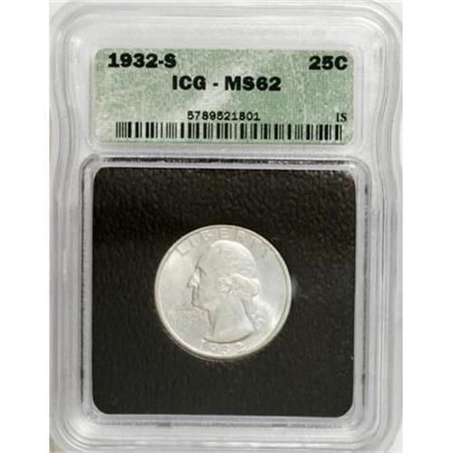 <B>1932-S 25C MS62 ICG.</B></I> Well struck with satin luster and silver-gray surfaces that display hints of reddish-tan patina under close scrutiny. A mere handful of tiny marks occur on each side of this key date Washington quarter. <BR><BR><B>Coin Engraver:</B> John Flanagan<BR><BR><b>Shipping:</b> Coins & Currency (<a target="_blank" href="http://www.heritageauctions.com/common/shipping.php">view shipping information</a>)