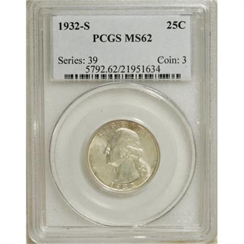 <B>1932-S 25C MS62 PCGS.</B></I> Subtle pastel-yellow shadings grace each side of this softly lustrous key-date quarter, and a small patch of rose-violet toning appears at the R of LIBERTY. Well-defined with a number of wispy flaws that preclude Select status.<BR><BR><B>Coin Engraver:</B> John Flanagan<BR><BR><b>Shipping:</b> Coins & Currency (<a target="_blank" href="http://www.heritageauctions.com/common/shipping.php">view shipping information</a>)