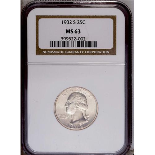 <B>1932-S<25C> MS63 NGC.</B></I> A Select Uncirculated example of this key-date issue. The surfaces are a pale silver-gray color and exhibit smooth, creamy luster. A small number of superficial marks limit the grade.