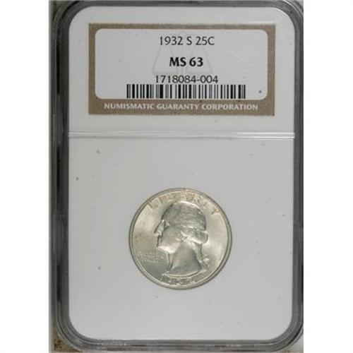 <B>1932-S 25C MS63 NGC.</B></I> This key date quarter possesses booming luster and blushes of light gold toning. The strike is precise, and the few marks present are surprisingly minor. At the time of issue, many believed the Washington quarter was a one-year circulating commemorative.<BR><BR><b>Shipping:</b> Coins & Currency (<a target="_blank" href="http://www.heritageauctions.com/common/shipping.php">view shipping information</a>)