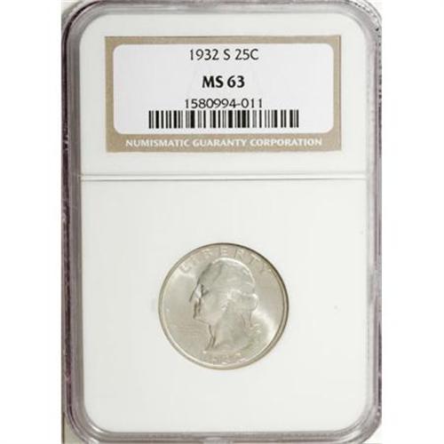 <B>1932-S 25C MS63 NGC.</B></I> Lustrous and untoned on the obverse, with golden-bronze and speckled forest-green patina over the reverse. This is a well struck key date from the first year of the Washington quarter series. A few trivial contact marks and luster breaks define the grade. <BR><BR><B>Coin Engraver:</B> John Flanagan<BR><BR><b>Shipping:</b> Coins & Currency (<a target="_blank" href="http://www.heritageauctions.com/common/shipping.php">view shipping information</a>)
