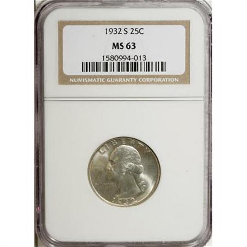 <B>1932-S 25C MS63 NGC.</B></I> Boldly struck, lustrous, and mostly untoned, save for occasional light splashes of olive patina. A handful of trivial marks are noted on each side. One of the two most important key dates in the Washington quarter series. <BR><BR><B>Coin Engraver:</B> John Flanagan<BR><BR><b>Shipping:</b> Coins & Currency (<a target="_blank" href="http://www.heritageauctions.com/common/shipping.php">view shipping information</a>)