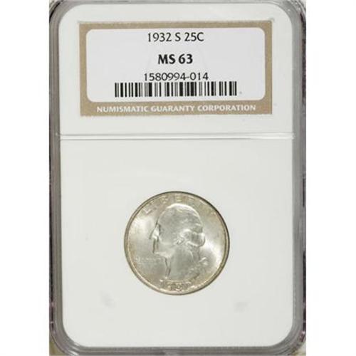 <B>1932-S 25C MS63 NGC.</B></I> This precisely struck example has light chestnut toning throughout the fields, while the devices are brilliant. A few faint obverse grazes are of little consequence.<BR><BR><B>Coin Engraver:</B> John Flanagan<BR><BR><b>Shipping:</b> Coins & Currency (<a target="_blank" href="http://www.heritageauctions.com/common/shipping.php">view shipping information</a>)