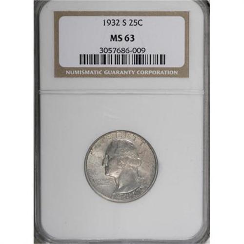 <B>1932-S 25C MS63 NGC.</B></I> Remarkably well struck, with much greater detail than seen on the average example. Satin luster and speckled patina are noted on both sides. A couple of wispy milling marks are observed on the eagle. This is an important key date, and is scarce at the Select Mint State grade level. <BR><BR><B>Coin Engraver:</B> John Flanagan<BR><BR><b>Shipping:</b> Coins & Currency (<a target="_blank" href="http://www.heritageauctions.com/common/shipping.php">view shipping information</a>)