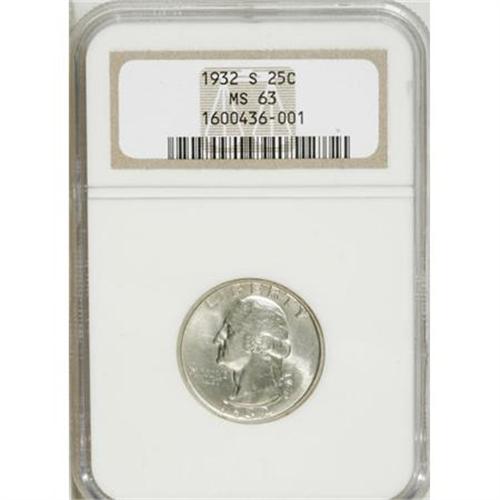 <B>1932-S 25C MS63 NGC.</B></I> Unusually well-defined for this first-year San Francisco issue with shining, minimally toned surfaces. Faint, wispy abrasions on and around the portrait preclude a finer designation. The consignor states that the coin is ex: David Lange.<BR><BR><B>Coin Engraver:</B> John Flanagan<BR><BR><b>Shipping:</b> Coins & Currency (<a target="_blank" href="http://www.heritageauctions.com/common/shipping.php">view shipping information</a>)