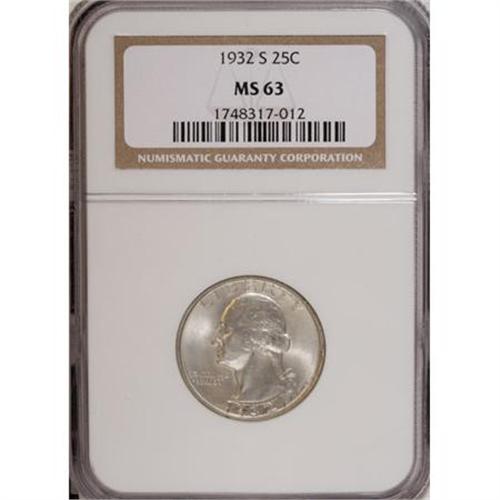 <B>1932-S 25C MS63 NGC.</B></I> Soft, pleasing luster enlivens subtly toned silver-gray surfaces. Surprisingly appealing for a Select coin, though close inspection reveals a few wispy abrasions.<BR><BR><B>Coin Engraver:</B> John Flanagan<BR><BR><b>Shipping:</b> Coins & Currency (<a target="_blank" href="http://www.heritageauctions.com/common/shipping.php">view shipping information</a>)