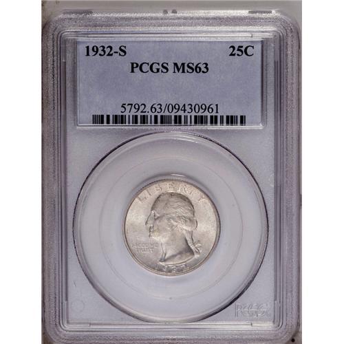 <B>1932-S<25C> MS63 PCGS.</B></I> A lovely example of this popular date with brilliant silver surfaces and traces of toning on each side. A small luster graze is visible above the motto in the left obverse field. Several Select and Choice Mint State examples of this date are offered in the present sale.