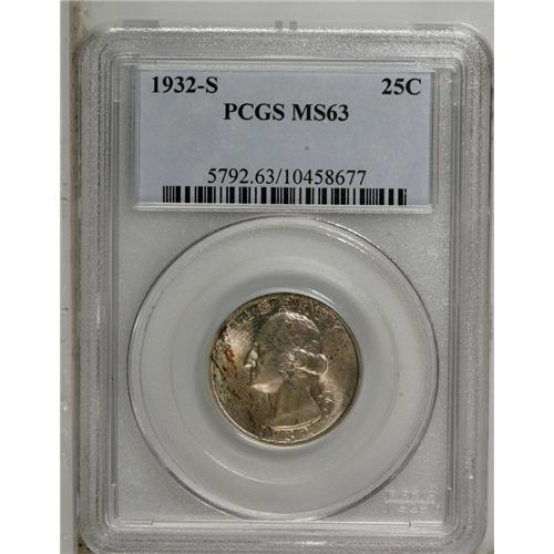 <B>1932-S<25C> MS63 PCGS.</B></I> Rose and heather obverse toning competes with a smattering of deeper amber-gray patina, while the reverse is a more consistent silver-gold. Well struck. A small die lump is noted near the reverse rim at 8:30.