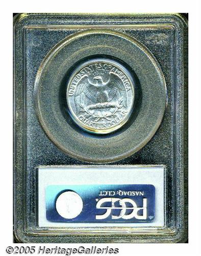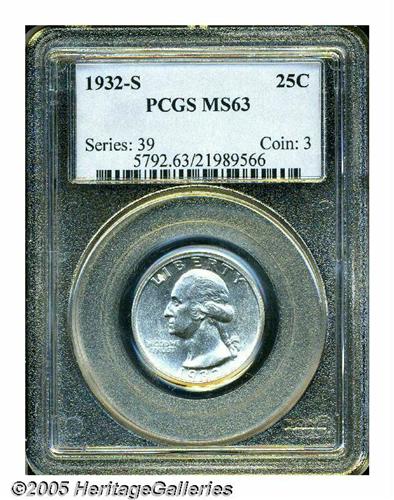<B>1932-S<25C> MS63 PCGS.</B></I> This first year key date issue from the San Francisco Mint is well struck with bright, untoned silver-gray surfaces that reveal noticeable die polish lines (as struck) in the right obverse field, a smooth, essentially pristine reverse, and a handful of minor marks on the obverse. A brief pinscratch extends from Washington's temple to the eyebrow.