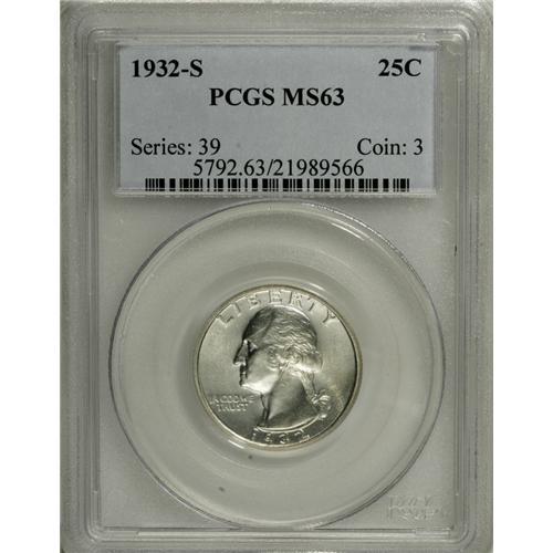 <B>1932-S 25C MS63 PCGS.</B></I> This first-year key-date issue from the San Francisco Mint is well struck with bright, untoned surfaces that reveal die polish lines in the right obverse field. A brief pinscratch extends from Washington's temple to the eyebrow.<BR><BR><b>Shipping:</b> Coins & Currency (<a target="_blank" href="http://www.heritageauctions.com/common/shipping.php">view shipping information</a>)