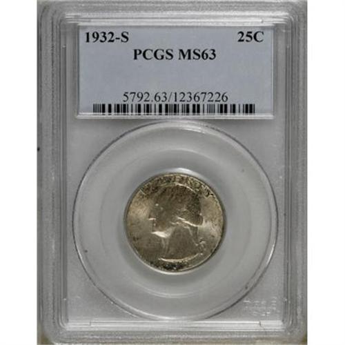 <B>1932-S 25C MS63 PCGS.</B></I> A primarily silver-gray piece with dots of sage toning at the upper obverse periphery. Well-defined with soft, pleasing luster and only faint abrasions. An attractive example of this key issue.<BR><BR><B>Coin Engraver:</B> John Flanagan<BR><BR><b>Shipping:</b> Coins & Currency (<a target="_blank" href="http://www.heritageauctions.com/common/shipping.php">view shipping information</a>)