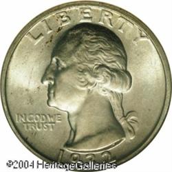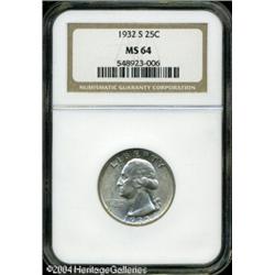 1932-S 25C MS64 NGC. The key-date 1932-S boasts th <B>1932-S 25C MS64 NGC.</B></I> The key-date 1932-S boasts the lowest mintage (408,000 pieces) in the entire regular-issue series, and has a desirability second only to the 1932-D. Despite its lower mintage, 1932-S quarters were more aggressively saved in Mint State than their Denver counterparts, which is evident from the certified population figures. NGC and PCGS, as of October 2004, have certified a total of 2,882 1932-S quarters, as compared to only 1,881 1932-D specimens. The near-Gem offered here has sharply struck motifs, and a thin veneer of gold, light violet, and pale-blue toning on the obverse, which deepens somewhat on the reverse. A few tiny marks on Washington's cheek and the eagle's legs limit the grade. NGC has graded only 52 coins higher. <BR><BR><B>Important notice:</B> Heritage usually auctions material at the rate of 200-250 lots per hour. On some occasions eBay Live bid software or the Internet may not be able to keep up with the pace of the auction. We recommend placing a realistic absentee bid now as insurance to avoid disappointment. Occasionally the auctioneer may eliminate or reject an eBay Live bid, and the auctioneer may also reopen a lot after the close of the eBay live bidding (usually because we missed an audience bid), and may reject your bid even if it shows you as the winning bidder. By bidding via eBay Live, you agree that Heritage may award the lot to another bidder at its sole discretion under the circumstances described above or any other reasonable circumstances. Since eBay bids are not shown to us until we open the lot on the floor, we treat those bids just like floor bids. In most cases the floor responds before the eBay bid is presented to us, due to Internet lag time, so for consistency we have made it a policy that floor bids are always considered first over tie eBay live bids. Also please note that all Heritage lots purchased through eBay Live carry a 20% Buyer's Premium. Please make sure you read the Terms and Conditions before you bid. This lot is being auctioned in conjunction with a live floor auction by Heritage Galleries & Auctioneers. All final auction and invoice information will be supplied by Heritage Galleries & Auctioneers, and all other information should be considered preliminary. Lot:5981