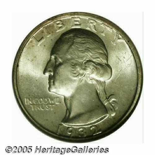 <B>1932-S<25C> MS64 NGC.</B></I> Well detailed and endowed with a vibrant, satiny sheen that is accented with speckles of golden peripheral color. A few shallow marks clustered on Washington's cheek and temple separate this first year key from Gem status.