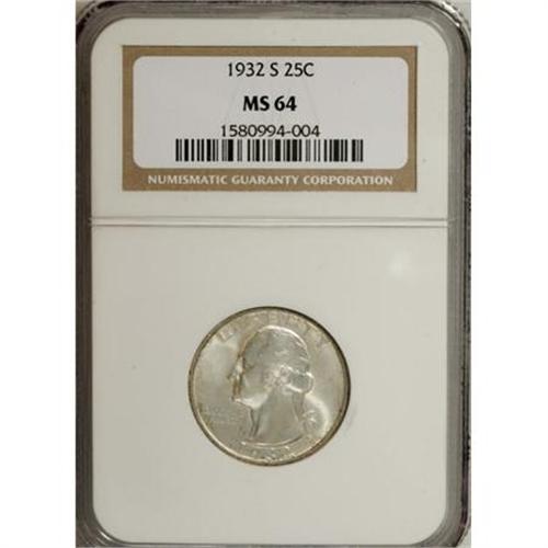 <B>1932-S 25C MS64 NGC.</B></I> Potent luster sweeps this sharply impressed key date near-Gem. Light to medium golden toning congregates near the rims. A few faint marks on the left obverse determine the grade.<BR><BR><B>Coin Engraver:</B> John Flanagan<BR><BR><b>Shipping:</b> Coins & Currency (<a target="_blank" href="http://www.heritageauctions.com/common/shipping.php">view shipping information</a>)
