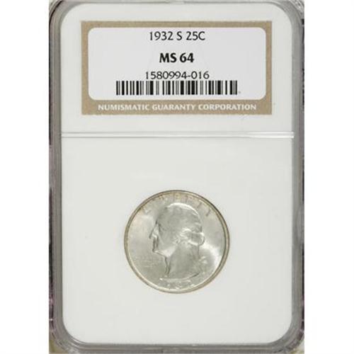 <B>1932-S 25C MS64 NGC.</B></I> Booming luster sweeps the lightly toned surfaces of this lovely near-Gem. The obverse is splendidly smooth, while the reverse has a few small marks.<BR><BR><B>Coin Engraver:</B> John Flanagan<BR><BR><b>Shipping:</b> Coins & Currency (<a target="_blank" href="http://www.heritageauctions.com/common/shipping.php">view shipping information</a>)