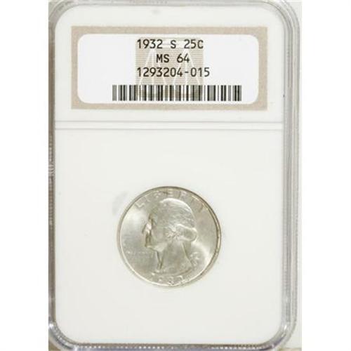 <B>1932-S 25C MS64 NGC.</B></I> Faint traces of light gold make occasional visits to the lustrous surfaces of this key-date Washington. Nicely struck on the design features. A few light marks define the grade.<BR><BR><B>Coin Engraver:</B> John Flanagan<BR><BR><b>Shipping:</b> Coins & Currency (<a target="_blank" href="http://www.heritageauctions.com/common/shipping.php">view shipping information</a>)