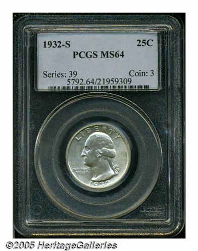 <B>1932-S<25C> MS64 PCGS.</B></I> A brilliant and satiny example of this scarce and always-popular key issue Washington quarter. Sharply defined throughout with only the slightest marks that keep the coin from an even higher grade.