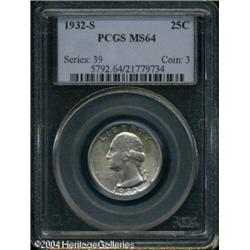 1932-S 25C MS64 PCGS. A creamy borderline Gem exam <B>1932-S 25C MS64 PCGS.</B></I> A creamy borderline Gem example with bits of reddish-gold toning over each side. The freshness and originality of this popular key is its strongest attribute. <BR><BR><B>Important notice:</B> Heritage usually auctions material at the rate of 200-250 lots per hour. On some occasions eBay Live bid software or the Internet may not be able to keep up with the pace of the auction. We recommend placing a realistic absentee bid now as insurance to avoid disappointment. Occasionally the auctioneer may eliminate or reject an eBay Live bid, and the auctioneer may also reopen a lot after the close of the eBay live bidding (usually because we missed an audience bid), and may reject your bid even if it shows you as the winning bidder. By bidding via eBay Live, you agree that Heritage may award the lot to another bidder at its sole discretion under the circumstances described above or any other reasonable circumstances. Since eBay bids are not shown to us until we open the lot on the floor, we treat those bids just like floor bids. In most cases the floor responds before the eBay bid is presented to us, due to Internet lag time, so for consistency we have made it a policy that floor bids are always considered first over tie eBay live bids. Also please note that all Heritage lots purchased through eBay Live carry a 20% Buyer's Premium. Please make sure you read the Terms and Conditions before you bid. This lot is being auctioned in conjunction with a live floor auction by Heritage Galleries & Auctioneers. All final auction and invoice information will be supplied by Heritage Galleries & Auctioneers, and all other information should be considered preliminary. Lot:5987
