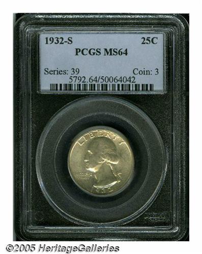 <B>1932-S<25C> MS64 PCGS.</B></I> A lustrous and essentially brilliant near-Gem whose only concession to toning is a light overlay of golden on the obverse. Very pleasing surfaces overall and an impressive example of this desirable key date.