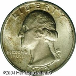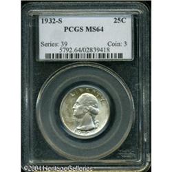 1932-S 25C MS64 PCGS. A traditional key date Washi <B>1932-S 25C MS64 PCGS.</B></I> A traditional key date Washington quarter, with bright luster and a dash of golden color above and to the left of the portrait, and on the upper and lower areas of the reverse. A single noticeable contact mark, on the eagle's breast, is the only mentionable distraction. <BR><BR><B>Important notice:</B> Heritage usually auctions material at the rate of 200-250 lots per hour. On some occasions eBay Live bid software or the Internet may not be able to keep up with the pace of the auction. We recommend placing a realistic absentee bid now as insurance to avoid disappointment. Occasionally the auctioneer may eliminate or reject an eBay Live bid, and the auctioneer may also reopen a lot after the close of the eBay live bidding (usually because we missed an audience bid), and may reject your bid even if it shows you as the winning bidder. By bidding via eBay Live, you agree that Heritage may award the lot to another bidder at its sole discretion under the circumstances described above or any other reasonable circumstances. Since eBay bids are not shown to us until we open the lot on the floor, we treat those bids just like floor bids. In most cases the floor responds before the eBay bid is presented to us, due to Internet lag time, so for consistency we have made it a policy that floor bids are always considered first over tie eBay live bids. Also please note that all Heritage lots purchased through eBay Live carry a 20% Buyer's Premium. Please make sure you read the Terms and Conditions before you bid. This lot is being auctioned in conjunction with a live floor auction by Heritage Galleries & Auctioneers. All final auction and invoice information will be supplied by Heritage Galleries & Auctioneers, and all other information should be considered preliminary. Lot:5979