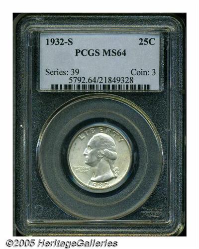 <B>1932-S<25C> MS64 PCGS.</B></I> An originally toned near-Gem, the surfaces show light, scattered toning with strong underlying luster. Typically abraded for the grade, a nice example of this key Washington Quarter.
