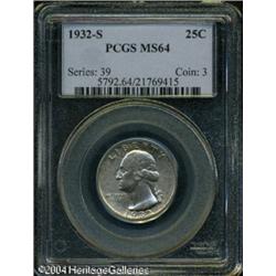 1932-S 25C MS64 PCGS. An originally toned near-Gem <B>1932-S 25C MS64 PCGS.</B></I> An originally toned near-Gem, the surfaces show light, scattered toning with strong underlying luster. Typically abraded for the grade, a nice example of this key Washington Quarter. <BR><BR><B>Important notice:</B> Heritage usually auctions material at the rate of 200-250 lots per hour. On some occasions eBay Live bid software or the Internet may not be able to keep up with the pace of the auction. We recommend placing a realistic absentee bid now as insurance to avoid disappointment. Occasionally the auctioneer may eliminate or reject an eBay Live bid, and the auctioneer may also reopen a lot after the close of the eBay live bidding (usually because we missed an audience bid), and may reject your bid even if it shows you as the winning bidder. By bidding via eBay Live, you agree that Heritage may award the lot to another bidder at its sole discretion under the circumstances described above or any other reasonable circumstances. Since eBay bids are not shown to us until we open the lot on the floor, we treat those bids just like floor bids. In most cases the floor responds before the eBay bid is presented to us, due to Internet lag time, so for consistency we have made it a policy that floor bids are always considered first over tie eBay live bids. Also please note that all Heritage lots purchased through eBay Live carry a 20% Buyer's Premium. Please make sure you read the Terms and Conditions before you bid. This lot is being auctioned in conjunction with a live floor auction by Heritage Galleries & Auctioneers. All final auction and invoice information will be supplied by Heritage Galleries & Auctioneers, and all other information should be considered preliminary. Lot:5984