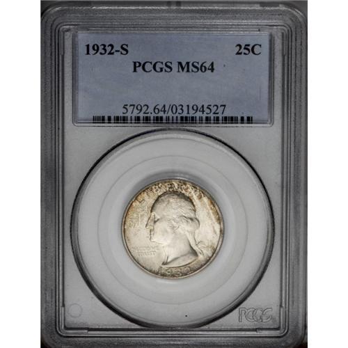 <B>1932-S<25C> MS64 PCGS.</B></I> Bright, lustrous surfaces display streaks of russet-brown patination that gravitate to the borders. The design features are well impressed, though the rear lines in the fasces are a touch soft. A few minor marks on Washington's portrait limit the grade.