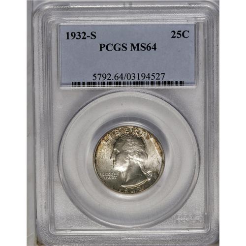 <B>1932-S<25C> MS64 PCGS.</B></I> Bright, lustrous surfaces display streaks of russet-brown patination that gravitate to the borders. The design features are well impressed, though the rear lines in the fasces are a touch soft. A few minor marks on Washington's portrait limit the grade.