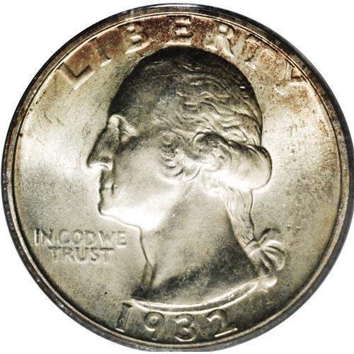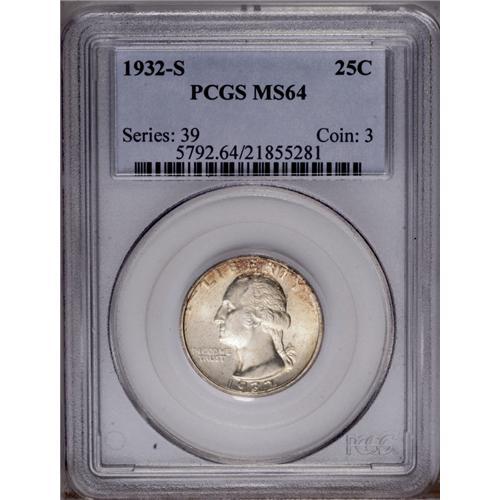 <B>1932-S<25C> MS64 PCGS.</B></I> Fully lustrous with an aesthetically pleasing, satiny sheen. The lightest overlay of pearl-gray iridescence is noted, and there is also a small area of deep amber-russet tinting at the top of the obverse. The appreciable lack of mentionable bagmarks leaves little doubt about the validity of the MS64 designation. One of the keys to the series, particularly in grades at the near-Gem level.