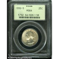 1932-S 25C MS64 PCGS. Fully struck and well preser <B>1932-S 25C MS64 PCGS.</B></I> Fully struck and well preserved, with frosty luster and dappled tan and lilac coloration that appears on the right side of the obverse, and in small doses on the reverse. A pleasing near-Gem example of this scarce key date. <BR><BR><B>Important notice:</B> Heritage usually auctions material at the rate of 200-250 lots per hour. On some occasions eBay Live bid software or the Internet may not be able to keep up with the pace of the auction. We recommend placing a realistic absentee bid now as insurance to avoid disappointment. Occasionally the auctioneer may eliminate or reject an eBay Live bid, and the auctioneer may also reopen a lot after the close of the eBay live bidding (usually because we missed an audience bid), and may reject your bid even if it shows you as the winning bidder. By bidding via eBay Live, you agree that Heritage may award the lot to another bidder at its sole discretion under the circumstances described above or any other reasonable circumstances. Since eBay bids are not shown to us until we open the lot on the floor, we treat those bids just like floor bids. In most cases the floor responds before the eBay bid is presented to us, due to Internet lag time, so for consistency we have made it a policy that floor bids are always considered first over tie eBay live bids. Also please note that all Heritage lots purchased through eBay Live carry a 20% Buyer's Premium. Please make sure you read the Terms and Conditions before you bid. This lot is being auctioned in conjunction with a live floor auction by Heritage Galleries & Auctioneers. All final auction and invoice information will be supplied by Heritage Galleries & Auctioneers, and all other information should be considered preliminary. Lot:5988