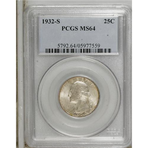 <B>1932-S 25C MS64 PCGS.</B></I> Light, mottled smoke-gray and olive-gold toning is seen on each side of this popular key-date issue. A couple of small reeding marks on the cheek and neck remove this piece from Gem consideration. Numerous die polish lines are visible in the area of the mintmark, a diagnostic for genuine pieces.<BR><BR><b>Shipping:</b> Coins & Currency (<a target="_blank" href="http://www.heritageauctions.com/common/shipping.php">view shipping information</a>)