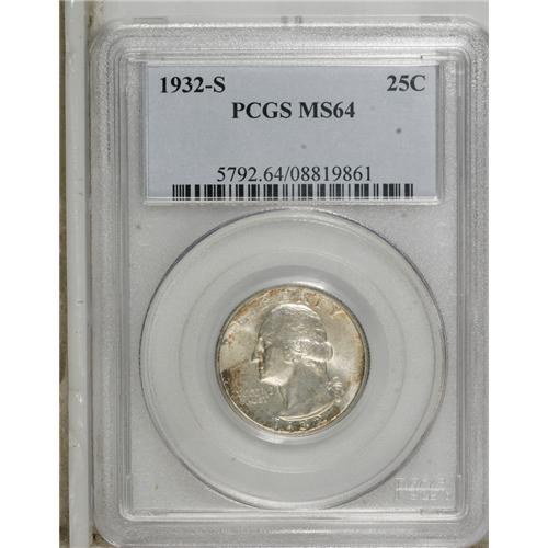 <B>1932-S 25C MS64 PCGS.</B></I> Lightly toned, this popular key has very few contact marks. Full mint luster radiates over each side. Well struck with wispy die cracks on both obverse and reverse. This first-year near-Gem is from a mintage of 408,000 pieces, the lowest in the history of the Washington quarter series.<BR><BR><b>Shipping:</b> Coins & Currency (<a target="_blank" href="http://www.heritageauctions.com/common/shipping.php">view shipping information</a>)