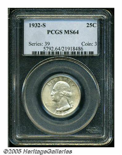 <B>1932-S<25C> MS64 PCGS.</B></I> Mint frost sparkles over each side with a light overlay of finely speckled silver-russet toning particularly over the obverse. An unquestionably original coin and very close to full Gem status.