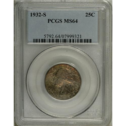 <B>1932-S 25C MS64 PCGS.</B></I> Mottled lavender, russet-bronze, and orange patina saturates the luminous surfaces of this near-Gem. A well struck example of this often-elusive first-year issue.<BR><BR><b>Shipping:</b> Coin/Currency (<a target="_blank" href="http://www.heritageauctions.com/common/shipping.php">view shipping information</a>)