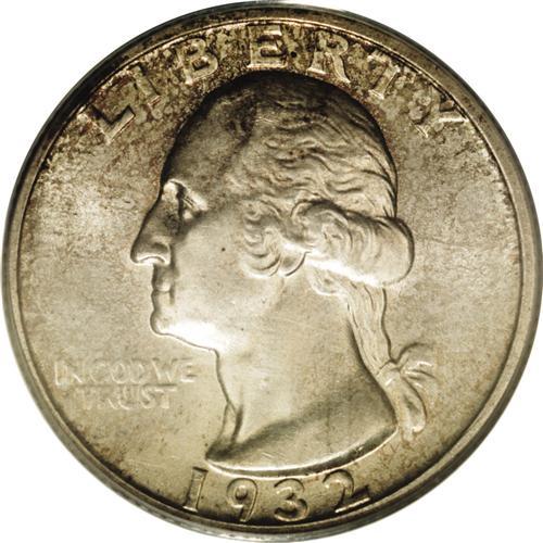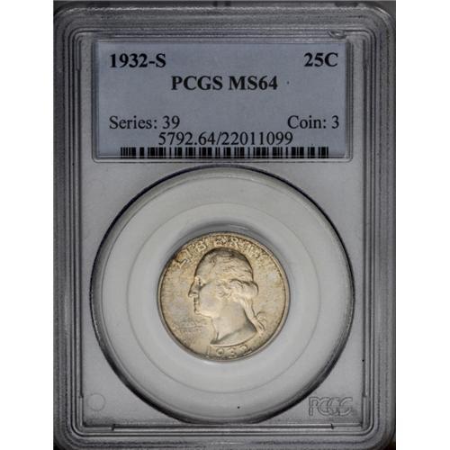 <B>1932-S<25C> MS64 PCGS.</B></I> One of the first-year keys of the series. This coin has clean fields and a light golden russet-brown toning. Washington's portrait is free from marks. The reverse is equally unblemished with some additional toning at the lower portion.