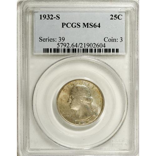 <B>1932-S 25C MS64 PCGS.</B></I> Sharply struck and highly lustrous with traces of pale gold color over brilliant silver-white surfaces. A few slight abrasions keep this piece from Gem quality.<BR><BR><b>Shipping:</b> Coin/Currency (<a target="_blank" href="http://www.heritageauctions.com/common/shipping.php">view shipping information</a>)
