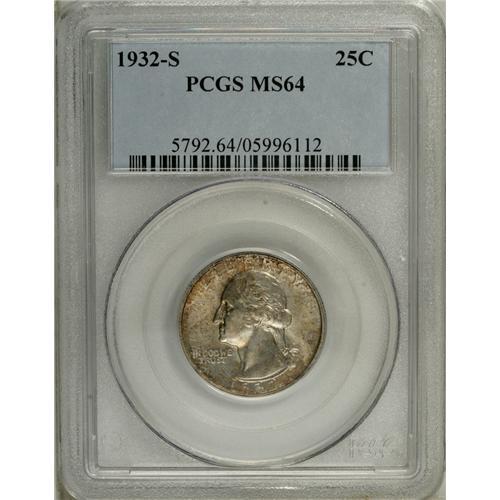 <B>1932-S 25C MS64 PCGS.</B></I> Silver-gray with patches of russet-orange on the obverse that are less intense on the reverse. Well struck and appealing with soft, yet pleasing luster.<BR><BR><b>Shipping:</b> Coin/Currency (<a target="_blank" href="http://www.heritageauctions.com/common/shipping.php">view shipping information</a>)