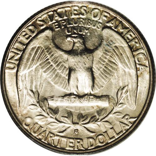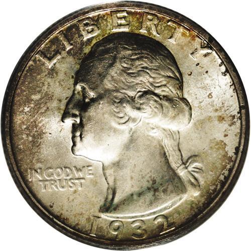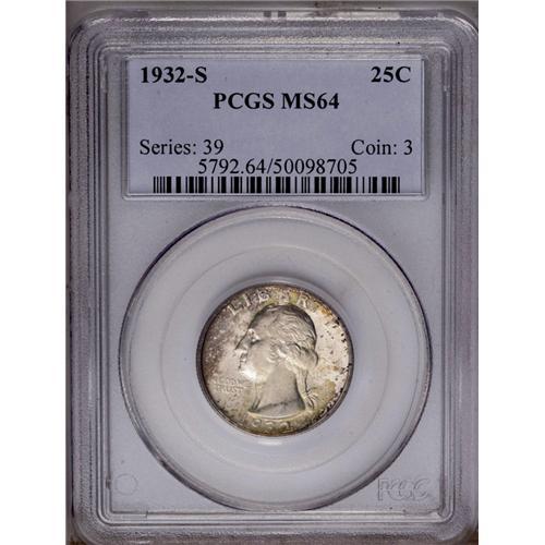 <B>1932-S<25C> MS64 PCGS.</B></I> The 1932-S quarter has the lowest mintage in the series with only 408,000 pieces, and it has been a highly sought after coin in all grades for at least the past 45 years. This is a bright and lustrous example with a significant presence of mottled multicolored iridescence, especially over the obverse. Close examination with a magnifier reveals a couple of grade-limiting abrasions on Washington's face and another mark in the left obverse field.
