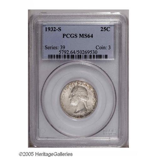 <B>1932-S<25C> MS64 PCGS.</B></I> The margins have blushes of deep russet and olive-green patina in a somewhat mottled fashion. Imposing cartwheel luster and a crisp strike combine and provide pleasing eye appeal. A few small marks on Washington's bust limit the grade.