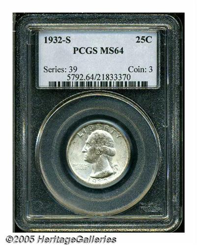 <B>1932-S<25C> MS64 PCGS.</B></I> The otherwise silver-gray surfaces reveal sprays of brown color over the obverse and lower left reverse. This is a lustrous, frosty example with swirling cartwheel effects and a not excessive number of abrasions for the assigned grade.