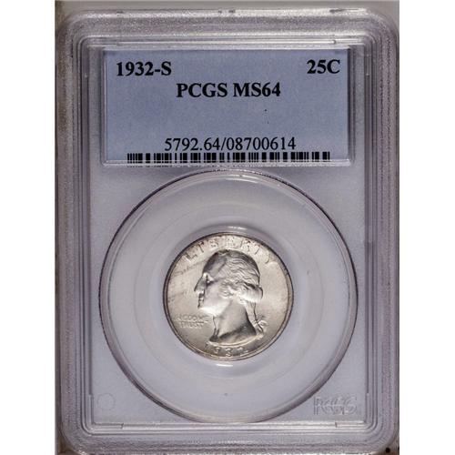 <B>1932-S 25C MS64 PCGS.</B></I> This example exhibits some splashes of yellow-gold patina, mostly on the obverse, over lustrous fields and sharply detailed devices. A great representative of this key date, well-preserved with hardly any abrasions.<BR><BR><b>Shipping:</b> Coins & Currency (<a target="_blank" href="http://www.heritageauctions.com/common/shipping.php">view shipping information</a>)