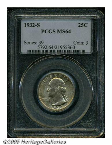 <B>1932-S<25C> MS64 PCGS.</B></I> This is a coin that comes very close to technically grading MS65. It certainly has the luster and eye appeal of a full Gem coin, and the all-important cheek of Washington is free from blemishes. However, a couple of milling marks are located on Washington's upper neck, just below the jawline, and there are a couple of other minor field marks at 3 o'clock on the obverse. As such, this piece represents excellent value for the collector. Attractively and originally toned with subtly variegated golden-brown and ice-blue toning.